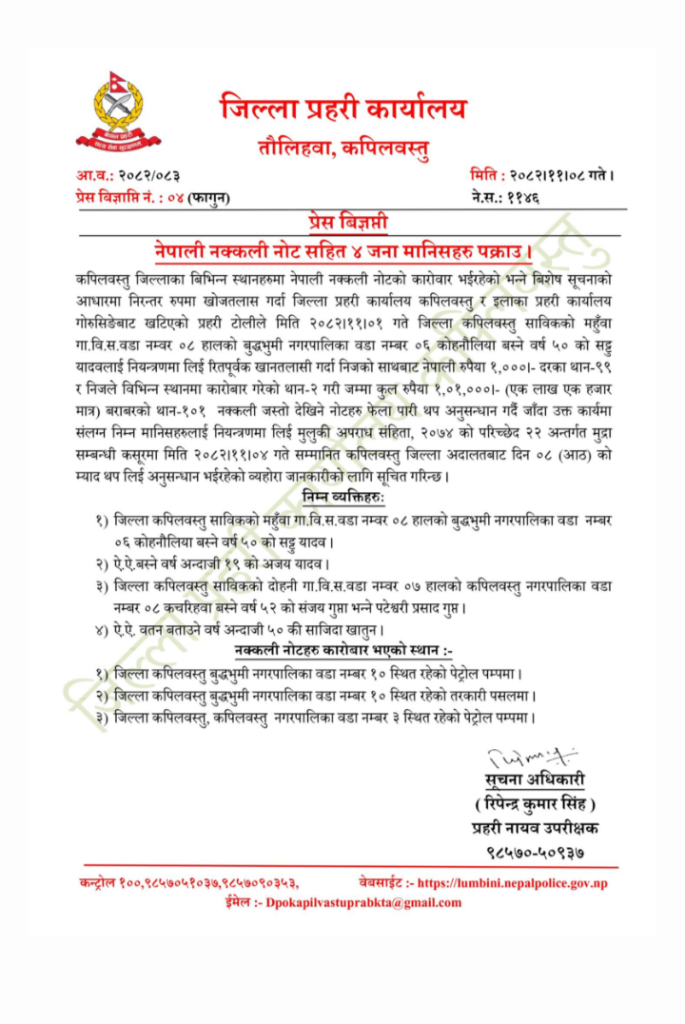 कपिलवस्तु : कपिलवस्तु जिल्लाका विभिन्न स्थानमा नेपाली नक्कली नोटको कारोबार भइरहेको भन्ने विशेष सूचनाको आधारमा प्रहरीले चार जनालाई नियन्त्रणमा लिएको छ।
