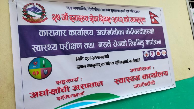 अर्घाखाँची : २७ औँ स्वास्थ्य सेवा दिवस २०८२ को अवसरमा अर्घाखाँचीको कारागार कार्यालयमा रहेका कैदीबन्दीहरूको स्वास्थ्य परीक्षण तथा नसर्ने रोगको स्क्रिनिङ कार्यक्रम सम्पन्न भएको छ । स्वास्थ्य कार्यालयको आयोजना र अर्घाखाँची अस्पतालको सहकार्य स्वास्थ्य शिविर सम्पन्न भएको हो। कार्यक्रममा अर्घाखाँची अस्पतालका प्रमुख डाक्टर जगन्नाथ तिवारीले मानिसहरूमा दिन प्रतिदिन नसर्ने रोगहरू बढीरहेकाले यस्ता खालका शिविर सञ्चालनले कैदीबन्दीहरूको स्वास्थ्य अवस्थाका बारेमा जानकारी लिने र नयाँ रोग पत्ता लगाउने र समयमै रोग पहिचान गरिसकेपछि स्वास्थ्य उपचार गर्न सहज हुने बताउनुभयो ।