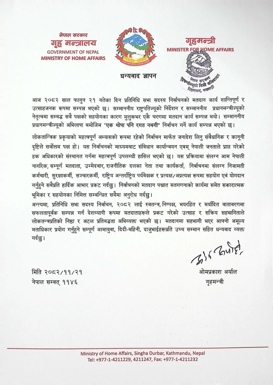 काठमाडौं : गृहमन्त्री ओमप्रकाश अर्यालले प्रतिनिधि सभा सदस्य निर्वाचनको मतदान कार्य शान्तिपूर्ण र उत्साहजनक रुपमा सम्पन्न भएकामा सबैलाई धन्यवाद दिएका छन् । एक थोपा पनि रगत बनगी निर्वाचन सम्पन्न भएको र यसमा सबैको साथ र सहयोग रहेको उनको भनाई छ।
