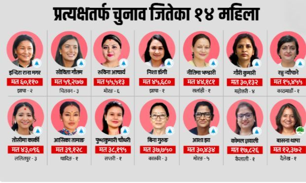 काठमाडौं : प्रतिनिधिसभा सदस्य निर्वाचनमा १४ जना महिला उम्मेदवार विजयी भएका छन् । राष्ट्रिय स्वतन्त्र पार्टी (रास्वपा) र नेपाली कांग्रेसबाट १४ जना महिला उम्मेदवार विजयी भएका हुन् ।